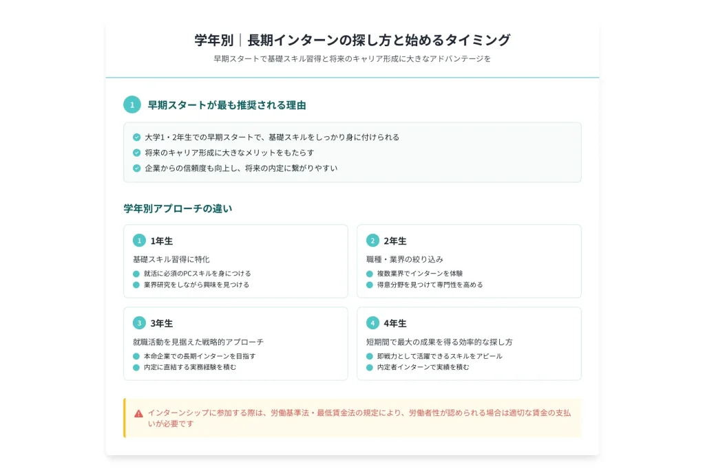 効果的な長期インターン探しには、段階的なアプローチが重要です。