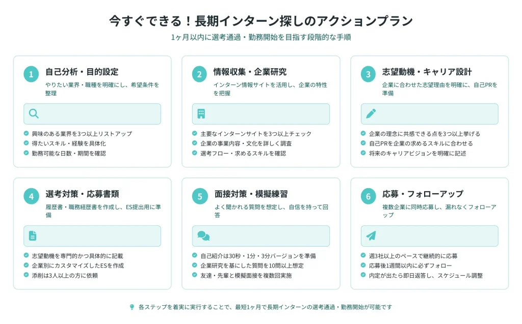 以下のアクションプランを実践することで、1ヶ月以内に長期インターンの選考を通過し、実際に勤務を開始することが可能です。