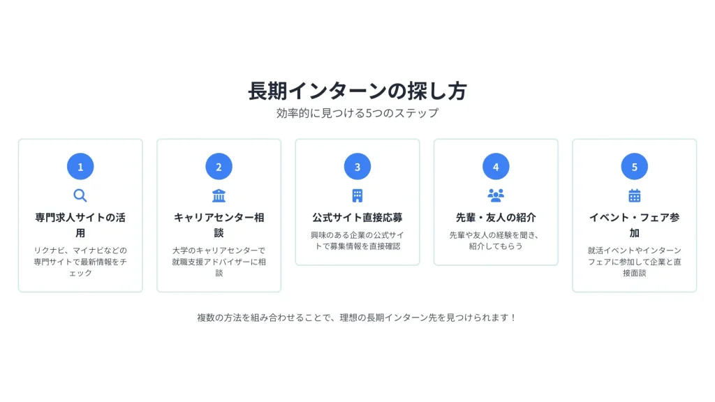 効果的な長期インターンの探し方として、専門求人サイトの活用、大学のキャリアセンターでの相談、企業の公式サイトでの直接応募、先輩や友人からの紹介、就活イベントやインターンフェアへの参加といった複数のアプローチを組み合わせることが成功への近道となります。