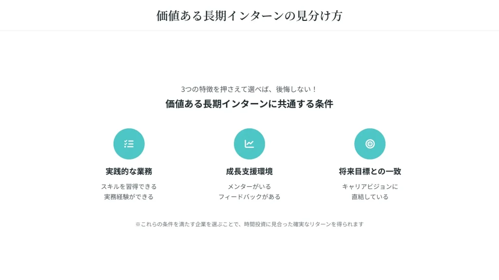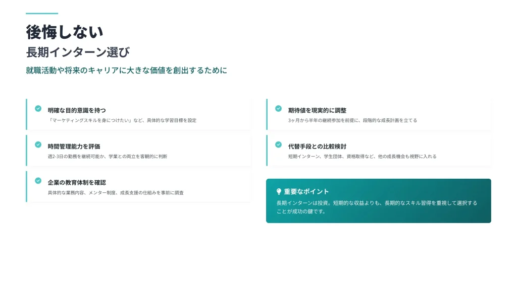 長期インターンは投資と考えて、短期的な収益よりも長期的なスキル習得を重視することが大切ですね