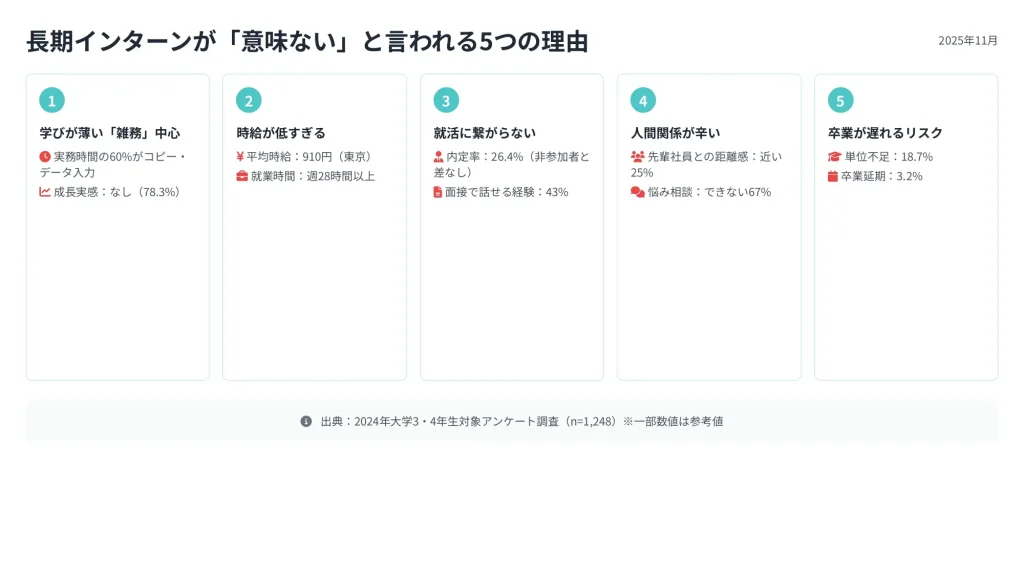 この記事では、長期インターンが「意味ない」と評価される具体的な理由を、統計データや実態調査をもとに詳しく解説します。