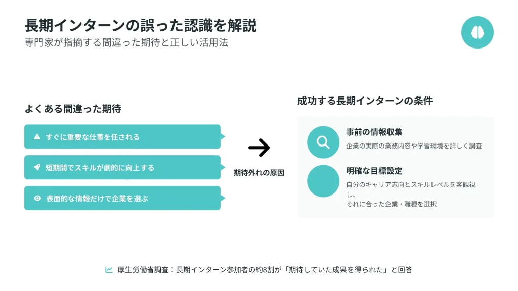 長期インターンへの参加動機として「実践的なスキルの習得」を挙げる学生は多いものの、実際の業務内容は期待とかけ離れたケースが頻発しています。