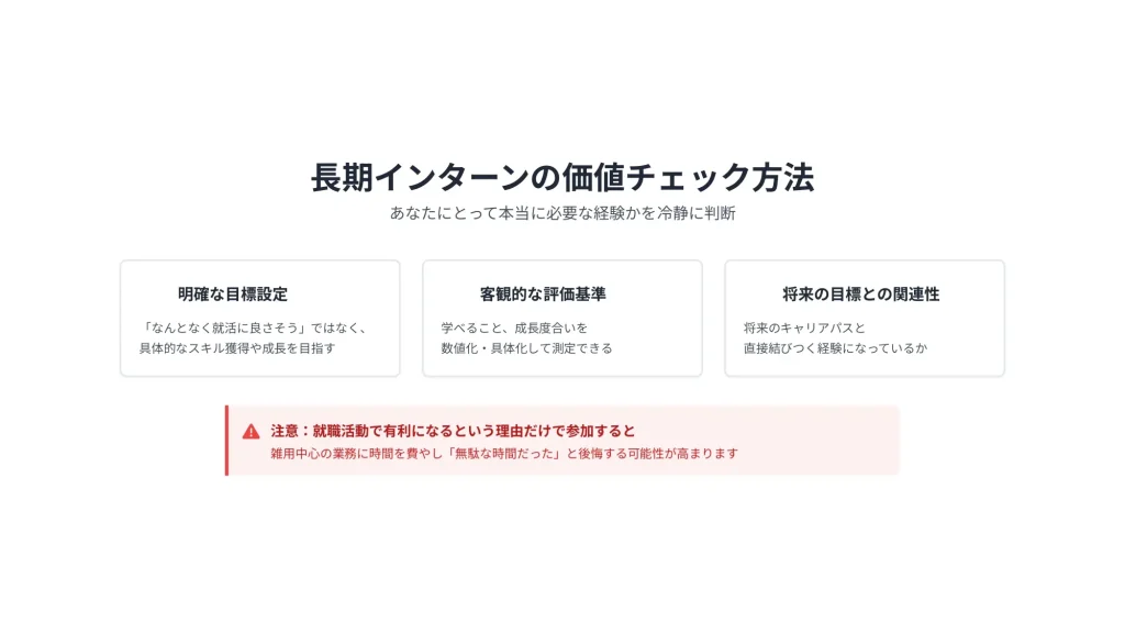 短期インターンや学生団体活動、資格取得、留学など、他の成長機会と比較して、自分の目標達成に最も効果的な方法を選択することが重要です。