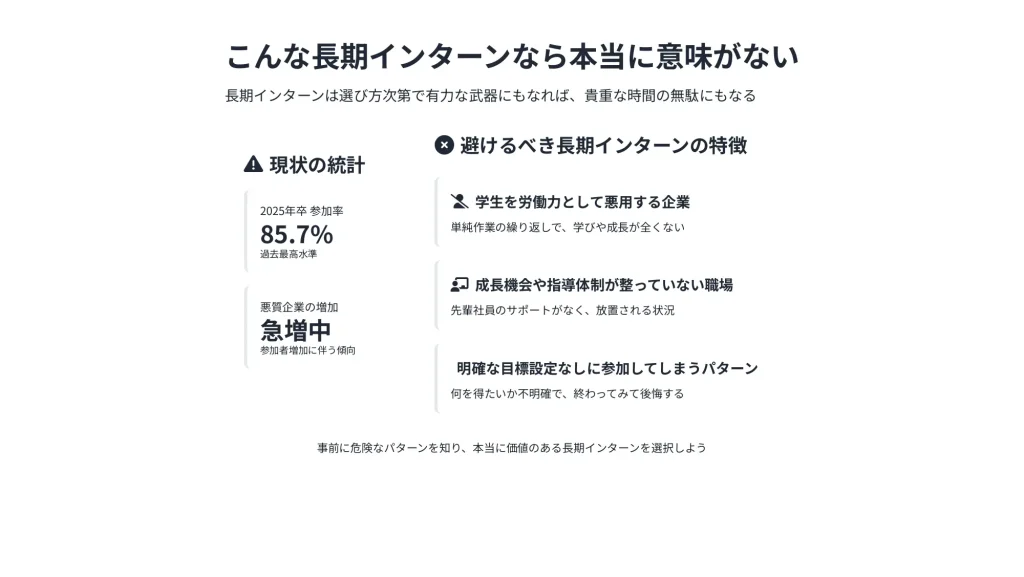 この記事では、長期インターンが「意味ない」と言われる5つの具体的理由から、本当に価値のない長期インターンのパターン、逆に価値がある長期インターンの見分け方まで徹底解説します。